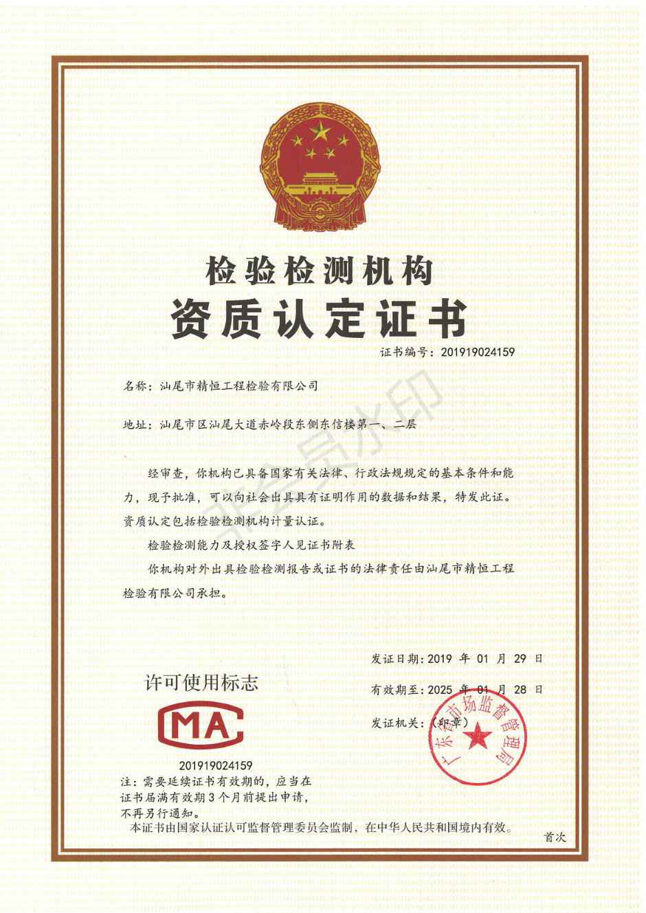 本公司2019年1月首次通过广东省市场监管局资质认定(计量认证),证书编号为:201919024159.通过计量认证项目有建设(地质勘察、公路交通、水利)工程质量检测1个领域8个大类 68产品类别769个参数。主要检测业务包括:主体结构工程现场检测;钢结构工程检测;地基基础工程检测;建筑幕墙工程检测;建筑节能检测;雷电防护装置检测;建筑工程施工现场安全防护用品检测;新材料检测服务(第三方检测、检测、测试、分析、认可、计量活动);产品质量、性能、安全性等检测服务;涉及结构安全项目的抽样检测;对进入施工现场的建筑材料、构配件的见证取样检测;人防工程检测;房屋安全检测(鉴定);岩土工程;混凝土工程;金属结构;噪声与振动防控监测服务;水污染监测服务;生活废水监测服务;环境保护监测;建筑工程测量;市政工程测量等建设工程质量的检验检测工作。