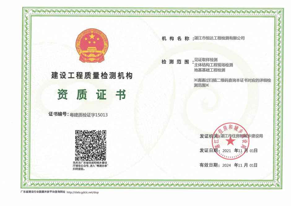 2、湛江市住房和建设局建设工程质量检测机构资质证书((证书编号:粤建质检证字15013)